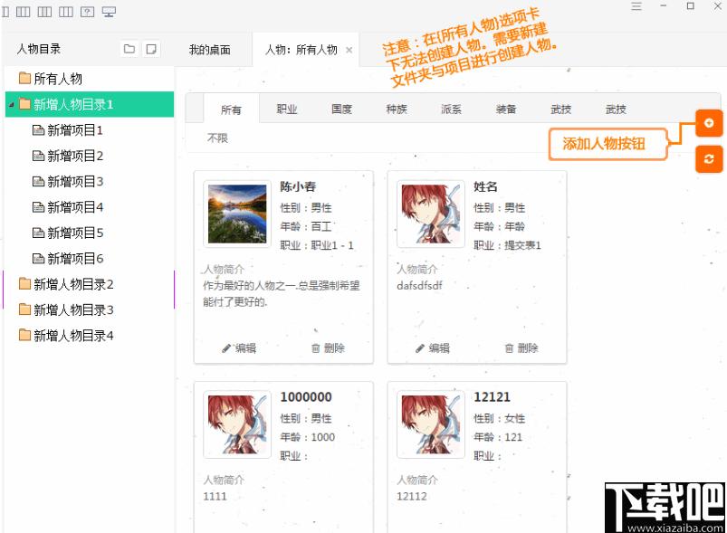 7、要创建设定话,在软件中启动默认的设定模板,模板项创建后您可以重新命名,只有模板项目可以与人物设定进行关联。